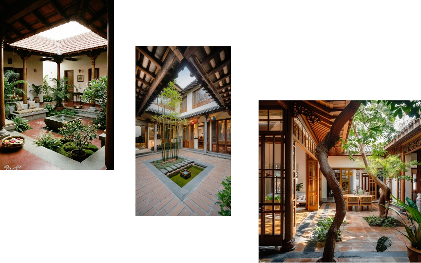 Đình viện (Sân chung): Khoảng sân trống ở giữa ba dãy nhà. Đây là "trái tim" của công trình, nơi đón ánh sáng, lưu thông không khí và là không gian sinh hoạt chung, phơi phóng nông sản hoặc trồng cây cảnh.